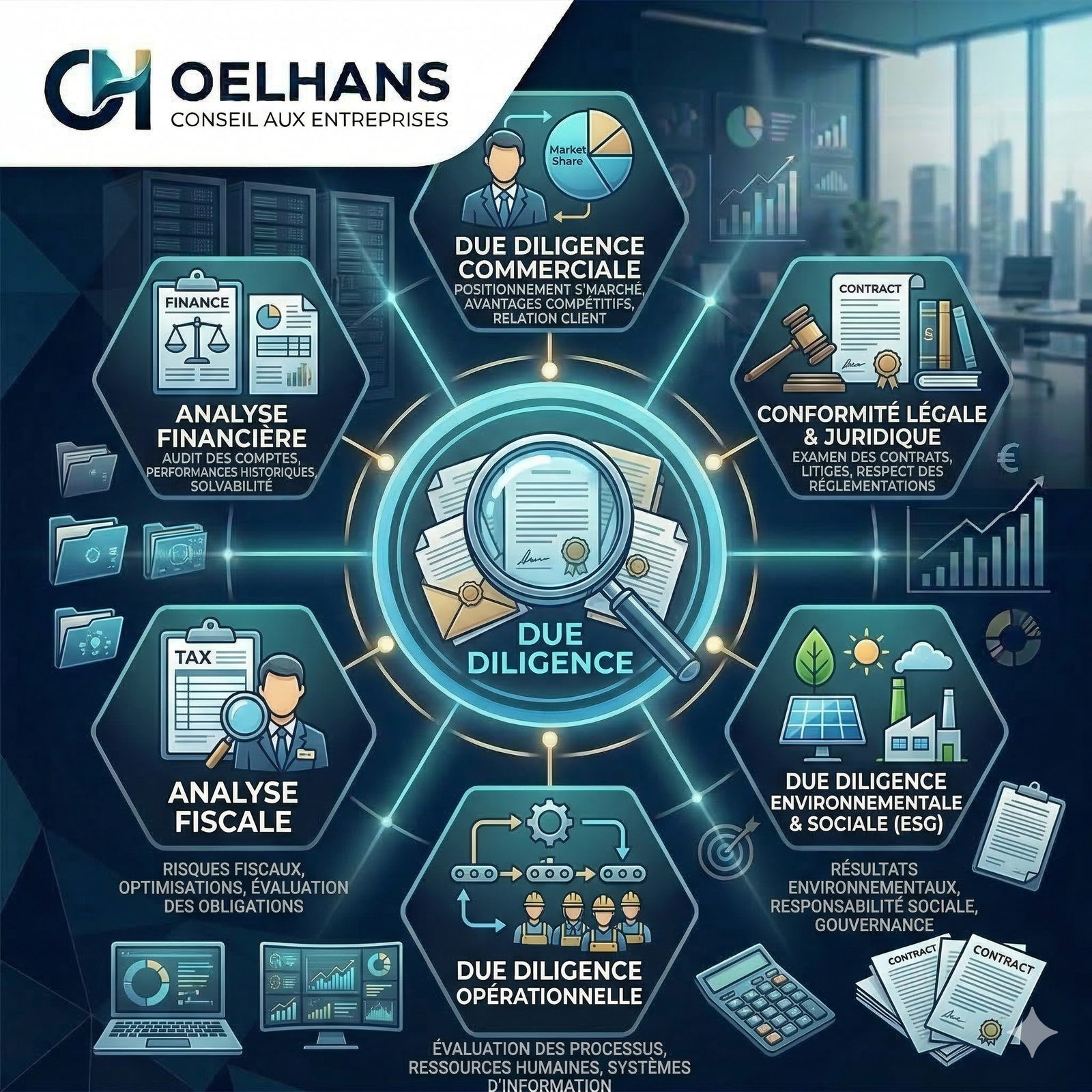 Analyse approfondie avant acquisition ou investissement. Évaluation des risques financiers, juridiques et opérationnels, valorisation de la cible et recommandations stratégiques. Rapport complet sous 3 semaines.
